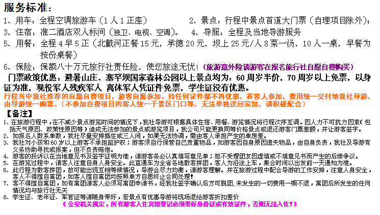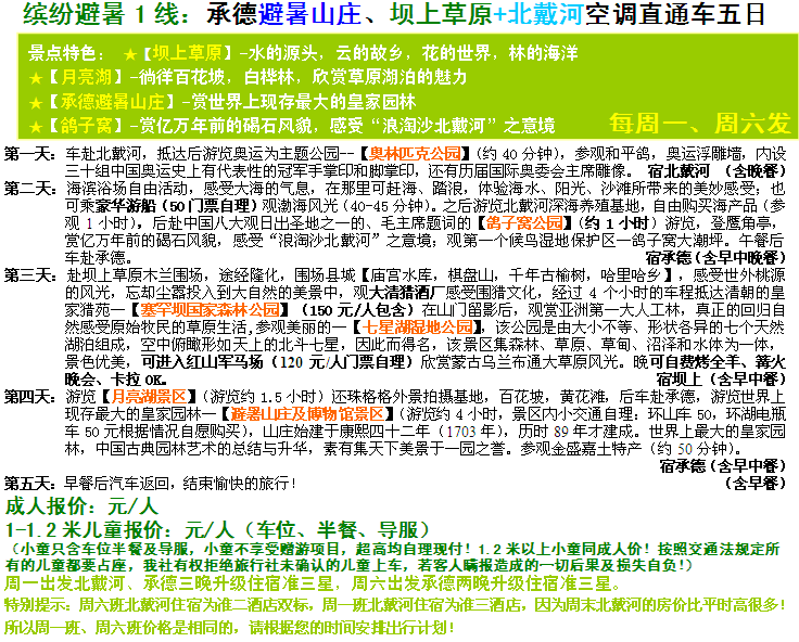 承德避暑山莊、壩上草原+北戴河空調(diào)直通車五日 每周一、周六發(fā)
