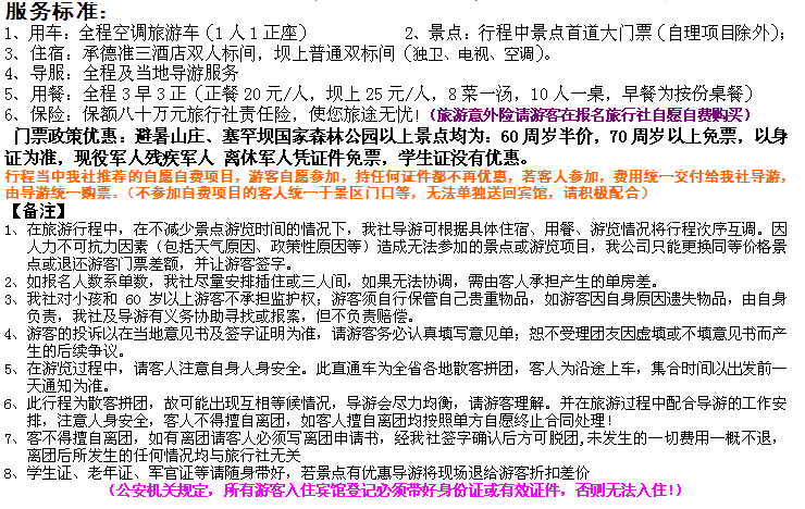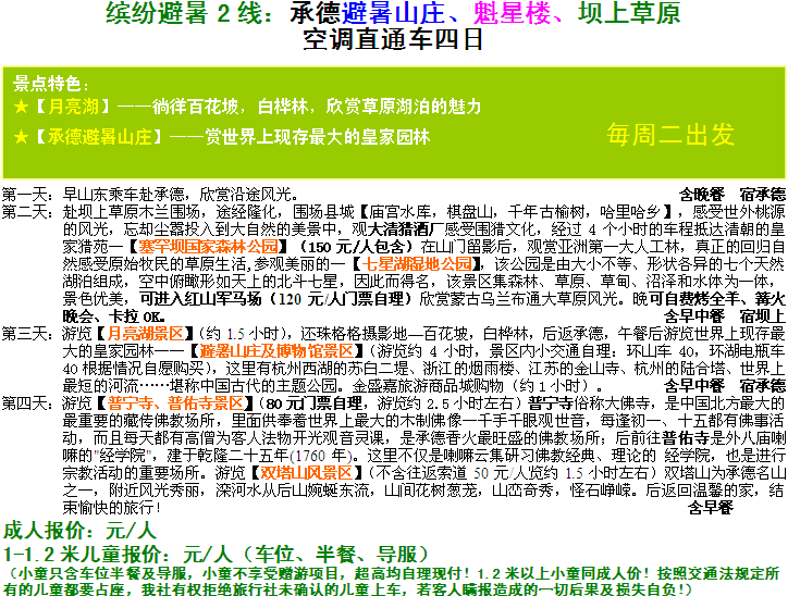 承德避暑山莊、魁星樓、壩上草原4日游 毎周二出發(fā)