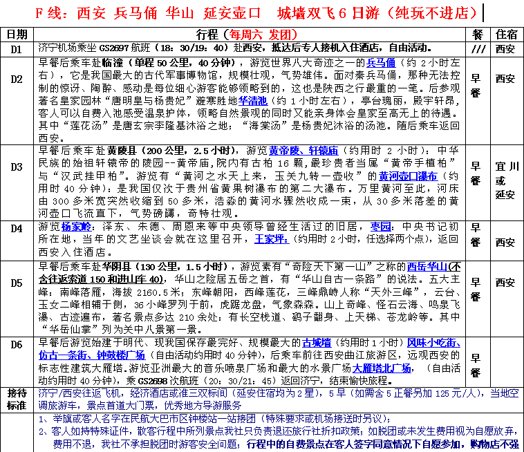 F線:西安 兵馬俑 華山 延安壺口 城墻雙飛6日游(純玩不進店) 每周六 發(fā)團
