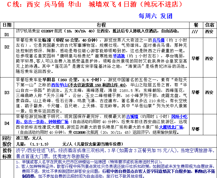 C線:西安 兵馬俑 華山 城墻雙飛4日游(純玩不進店)每周六 發(fā)團