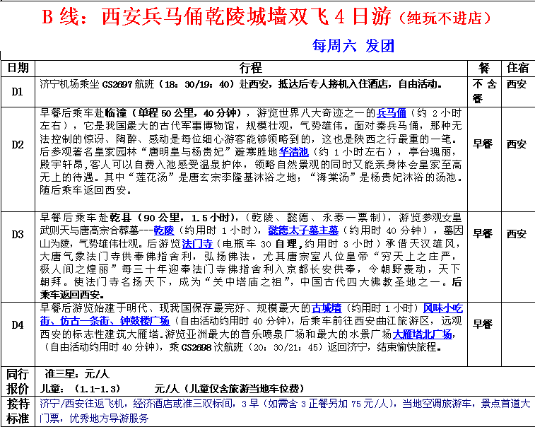 B線:西安兵馬俑乾陵城墻雙飛4日游(純玩不進店) 每周六 發(fā)團