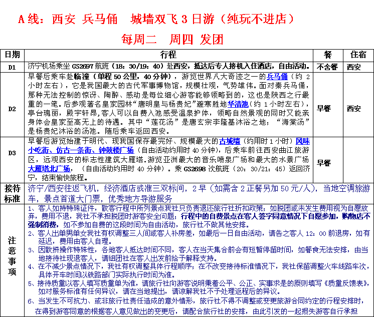 A線:西安 兵馬俑 城墻雙飛3日游(純玩不進店)每周二周四發(fā)團