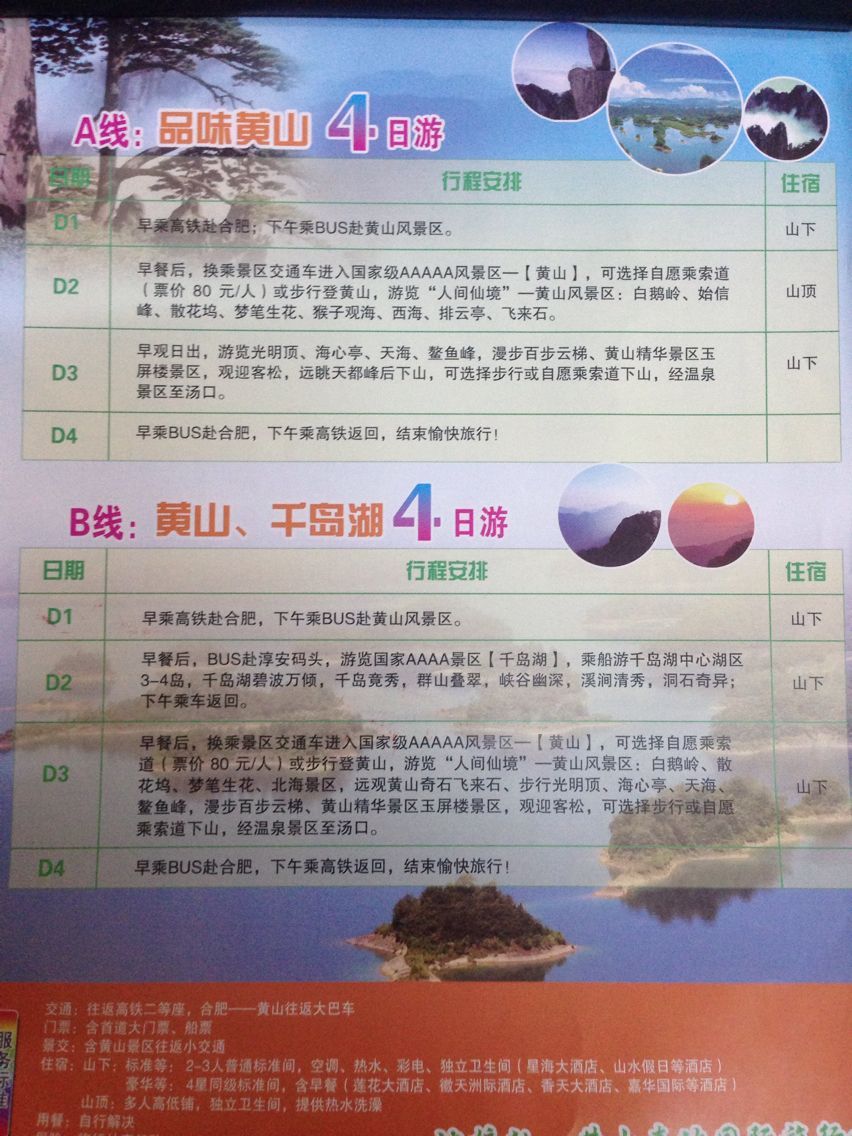 高鐵往返 A:品味黃山4天 B:黃山、千島湖4日游 C:黃山、西遞、宏村4日游 D:黃山、婺源4日游