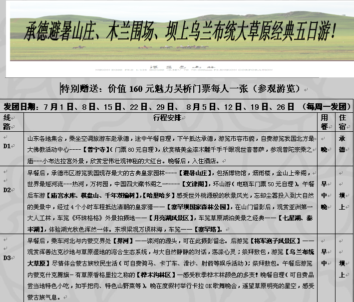 承德、木蘭圍場(chǎng)、壩上草原五日游 (每周二) 1100元 2014-6-19 本文被閱讀 5103 次