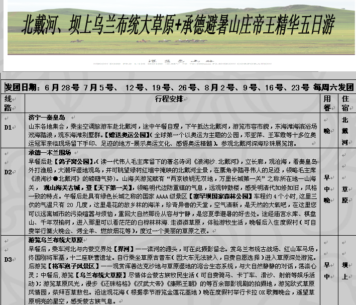 北戴河、烏蘭布統(tǒng)大草原、避暑山莊(每周六) 1280元 2014-6-19 本文被閱讀 5663 次