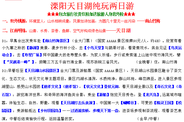 溧陽(yáng)天目湖純玩兩日游(周六)