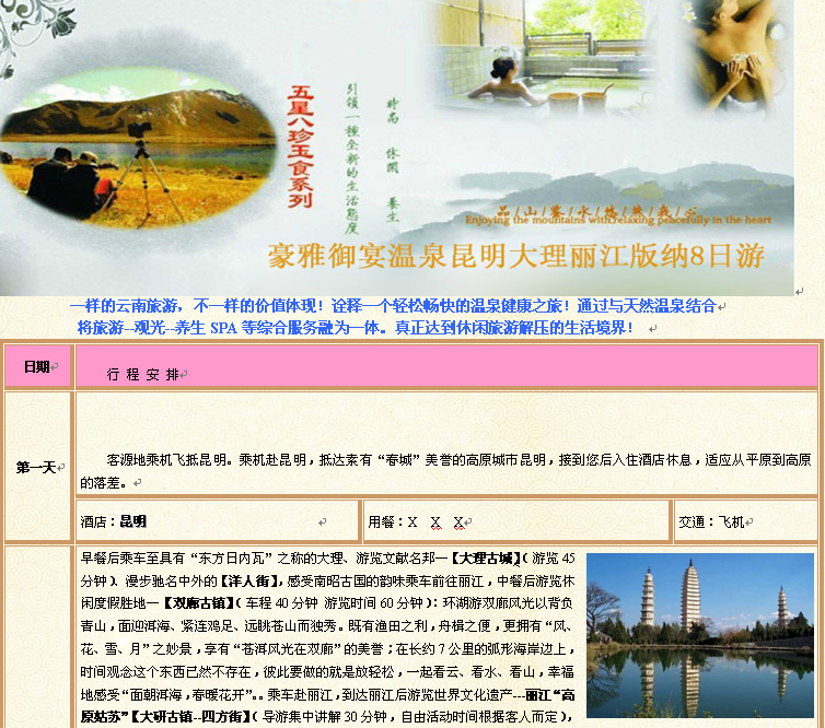 新豪雅之旅:昆明、大理、麗江、版納四飛8日游 5+5雙溫泉 2014-7-19 本文被閱讀 3166 次