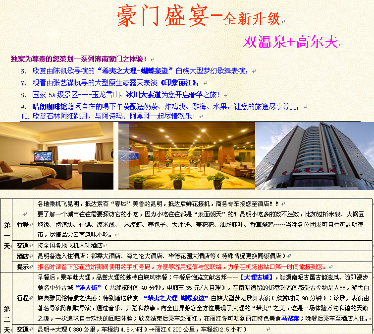 豪門盛宴:昆明、大理、麗江四飛8日游 5+5高爾夫雙溫泉 2014-7-19 本文被閱讀 3467 次