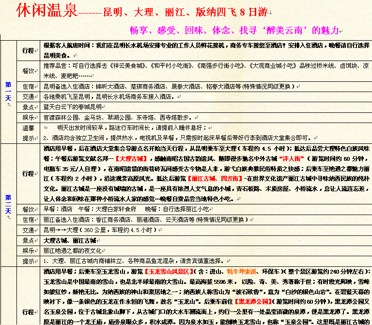 休閑溫泉:昆明、大理、麗江、版納四飛8日游 4+5溫泉 2014-7-19 本文被閱讀 3580 次