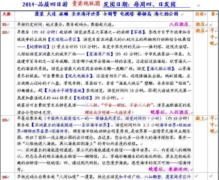 貴賓純玩團(tuán):蓬萊 大連 旅順 圣亞海洋世界 女騎警 電視塔 棒棰島 海之韻公園 發(fā)團(tuán)日期:每周四、日發(fā)團(tuán) 2014-8-16 本文被閱讀 4563 次