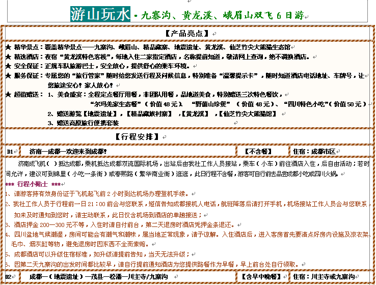 游山玩水•;九寨溝、黃龍溪、峨眉山雙飛6日游 10.17 10.30號