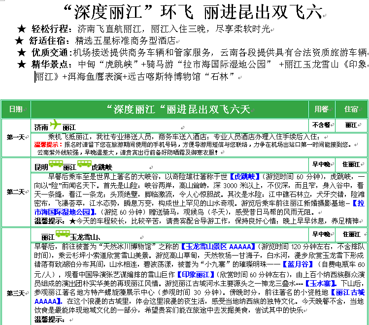 5.“深度麗江”環(huán)飛五星 麗進(jìn)昆出雙飛六天 每周二 四 六 26-56歲 6人內(nèi) 2014-10-23 本文被閱讀 3403 次