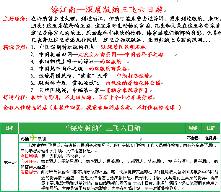 1. “傣江南”--深度版納三飛六日游 天天發(fā)團(tuán) 25-60歲 8人內(nèi)