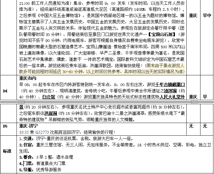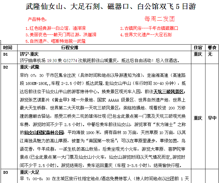 濟寧起止:重慶、武隆仙女山、大足石刻、白公館、渣滓洞 周二