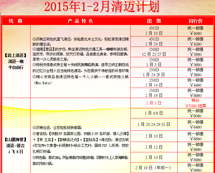 2015年 清邁6天 清邁+普吉島8天報價表 濟(jì)南起止 2014-12-26 本文被閱讀 5088 次