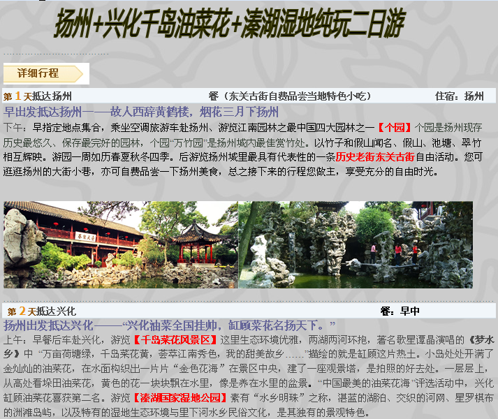 揚(yáng)州+興化千島油菜花+溱湖濕地純玩二日游(3月14號(hào)首發(fā),每周六發(fā)團(tuán))460元 2015-2-28 本文被閱讀 3427 次