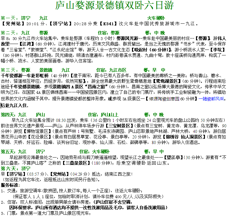 C8:廬山婺源景德鎮(zhèn)雙臥六日游(每周二、三、五、七,周四周五走加80元)1750元