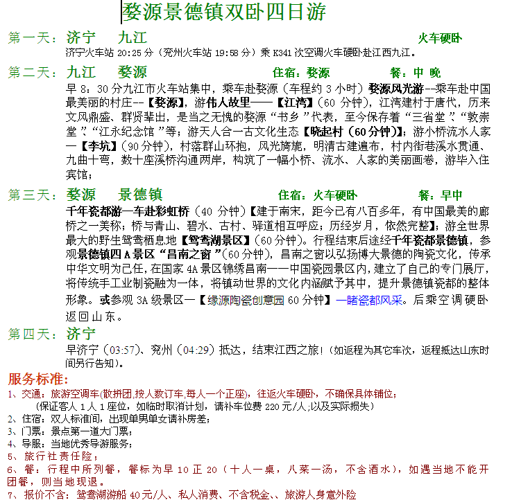 C4:婺源景德鎮(zhèn)雙臥四日游(常規(guī),每周二、三、五、七發(fā)團(tuán),周五走加80元)1200元 2015-2-28 本文被閱讀 3844 次