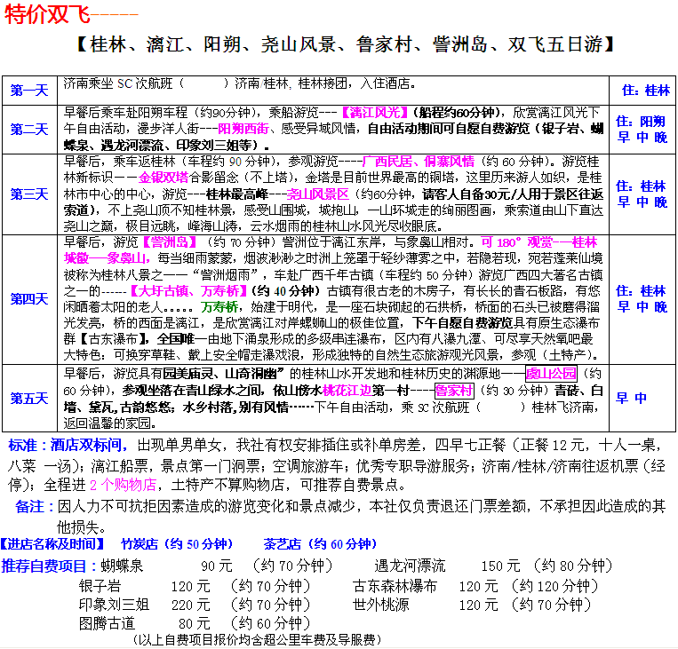特價雙飛【桂林、漓江、陽朔、堯山風景、魯家村、訾洲島、雙飛五日游】
