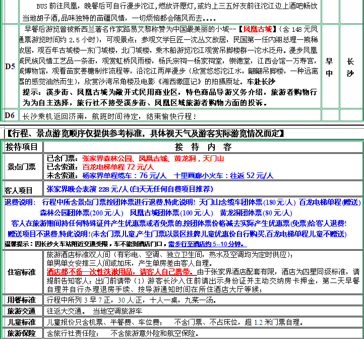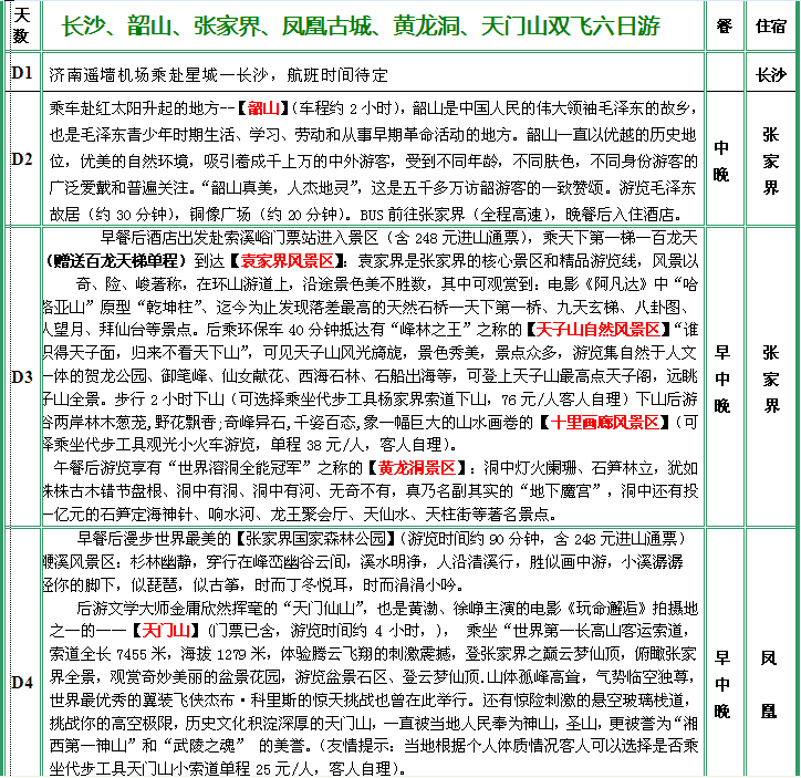 “天門傳奇” 長沙、韶山、張家界、天子山、金鞭溪、袁家界(含電梯)、鳳凰古城、黃龍洞、天門山(含纜車)(四星,白天無自費(fèi))雙飛六日