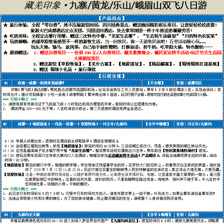 【藏羌印象】九寨溝、黃龍、樂(lè)山、峨眉山雙飛8日游