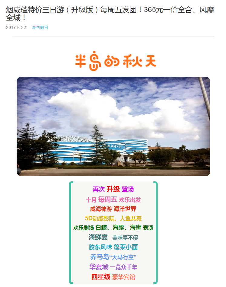 煙威蓬特價(jià)三日游(升級(jí)版)每周五發(fā)團(tuán)!365元一價(jià)全含、風(fēng)靡全城! 2017-10-20 本文被閱讀 2758 次