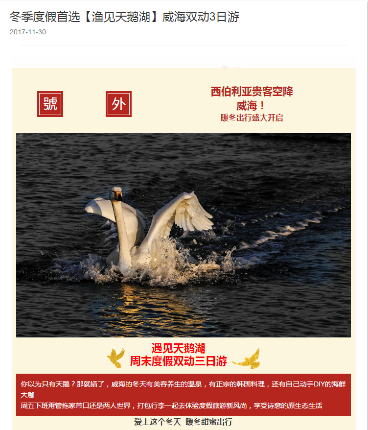 冬季度假首選【漁見天鵝湖】威海雙動3日游 2017-12-9 本文被閱讀 2716 次