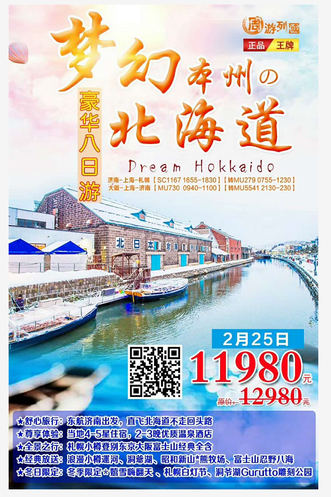 2月25號(新春)雪國浪漫”北海道+本州豪華8日(濟南起止) 2018-2-2 本文被閱讀 2565 次