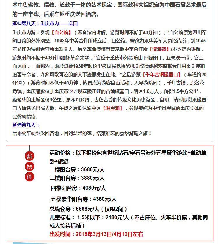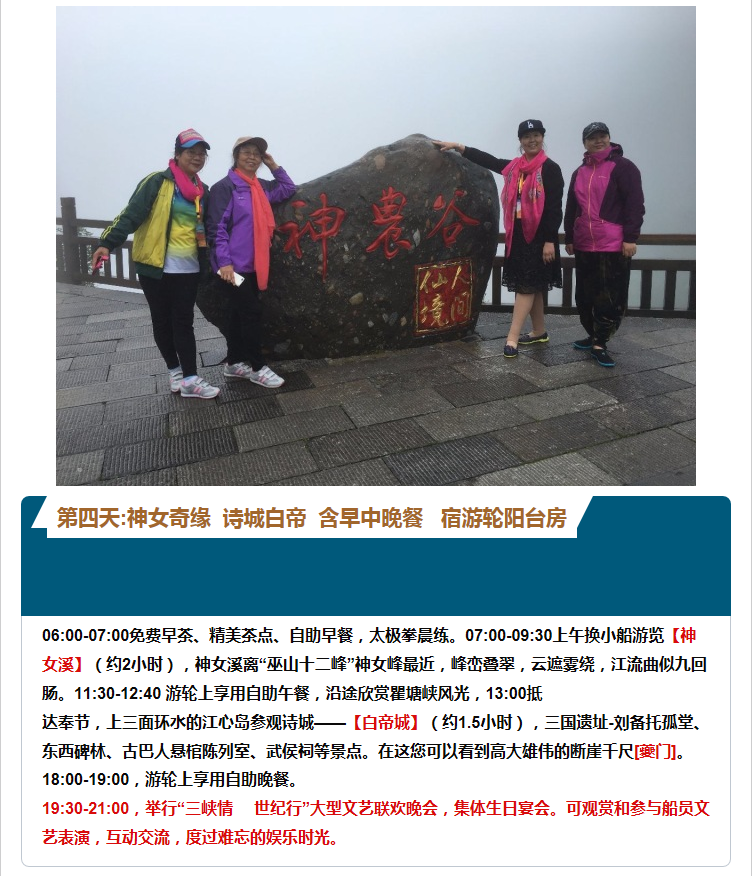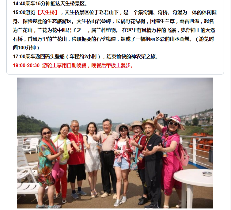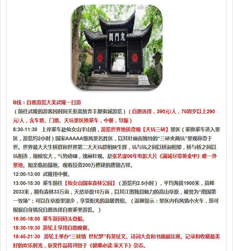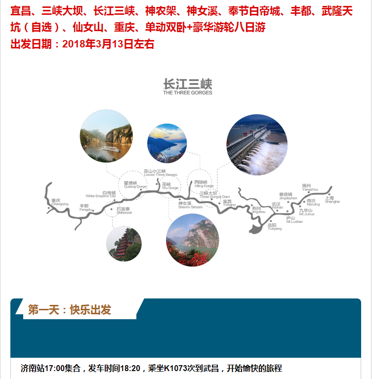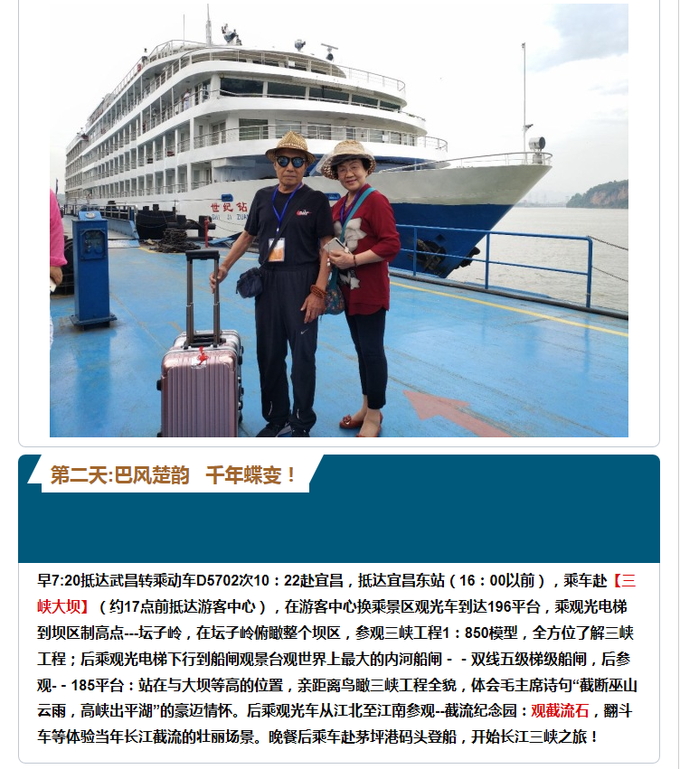 宜昌、三峽大壩、長江三峽、神農(nóng)架、神女溪、奉節(jié)白帝城、豐都、武隆天坑(自選)、仙女山、重慶、單動雙臥+豪華游輪八日游 2018-2-28 本文被閱讀 2764 次