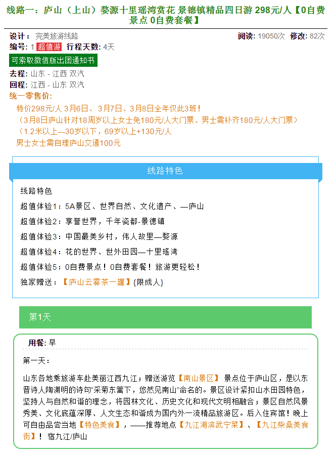 廬山(上山)婺源十里瑤灣賞花 景德鎮(zhèn)精品四日游 298元/人【0自費景點 0自費套餐】 2018-3-6 本文被閱讀 2973 次