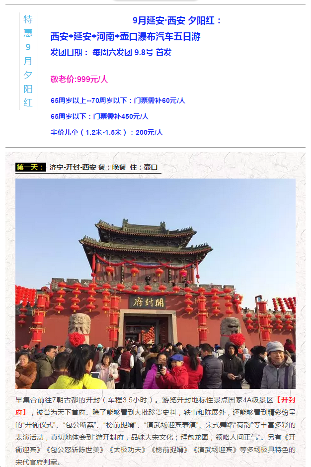 特惠9月夕陽(yáng)紅:西安+延安+河南+壺口瀑布汽車五日游 2018-9-9 本文被閱讀 2256 次