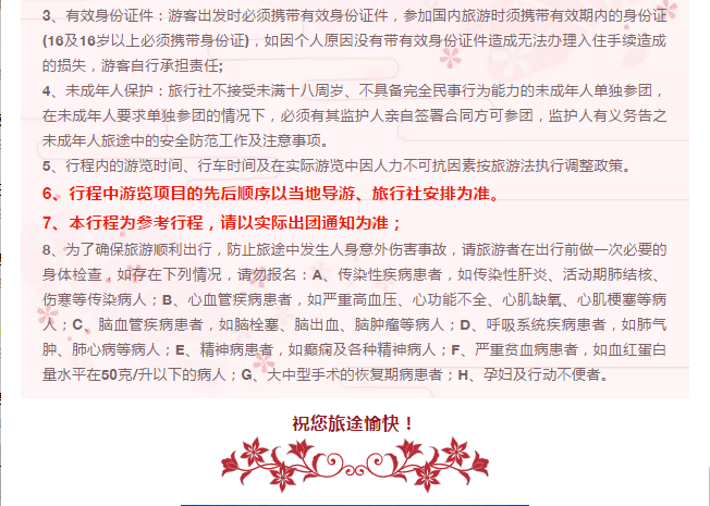 提示:報(bào)名選擇正規(guī)旅游合法資質(zhì)的旅行社,并簽訂全國(guó)統(tǒng)一電子旅游合同微信1:992345533微信2:15705475533 微信3:13792310010電話(huà):2345566/2345544/2345599/2345533/2345511