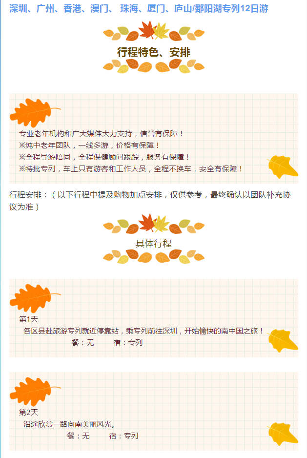 深圳、廣州、香港、澳門、 珠海、廈門、廬山/鄱陽湖專列12日游