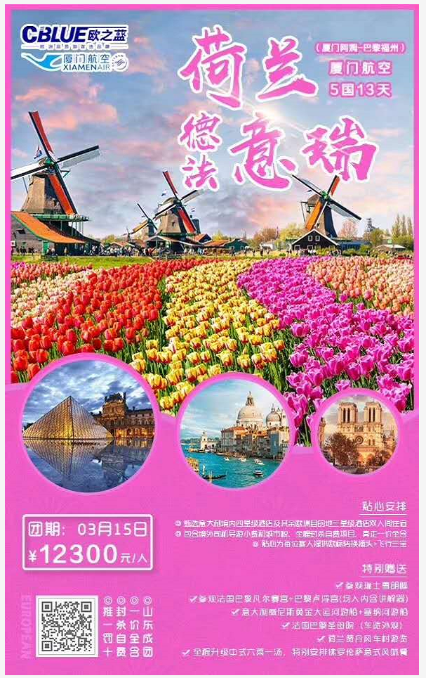 【歐之藍(lán)】山東成團(tuán),一價(jià)全含系列-荷蘭+德法意瑞5國(guó)13日(MF 阿姆-巴黎){雪朗峰+風(fēng)車村} 2019-2-18 本文被閱讀 2000 次