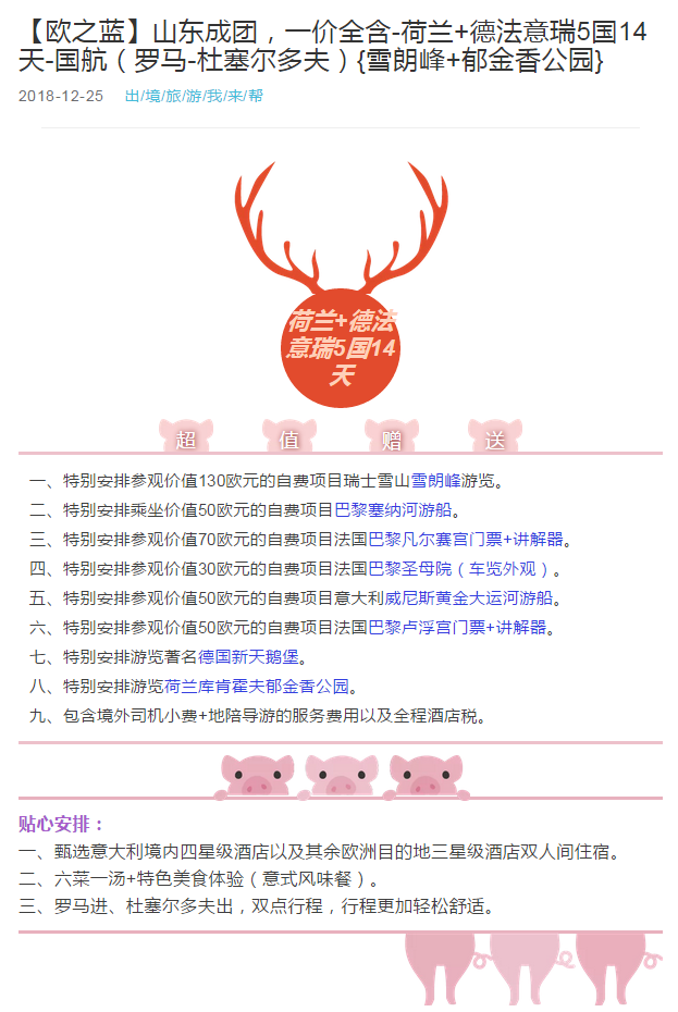 【歐之藍】山東成團,一價全含-荷蘭+德法意瑞5國14天-國航(羅馬-杜塞爾多夫){雪朗峰+郁金香公園} 2019-2-18 本文被閱讀 1981 次