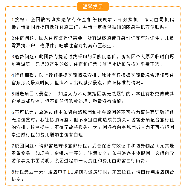 提示:報(bào)名選擇正規(guī)旅游合法資質(zhì)的旅行社,并簽訂全國(guó)統(tǒng)一電子旅游合同