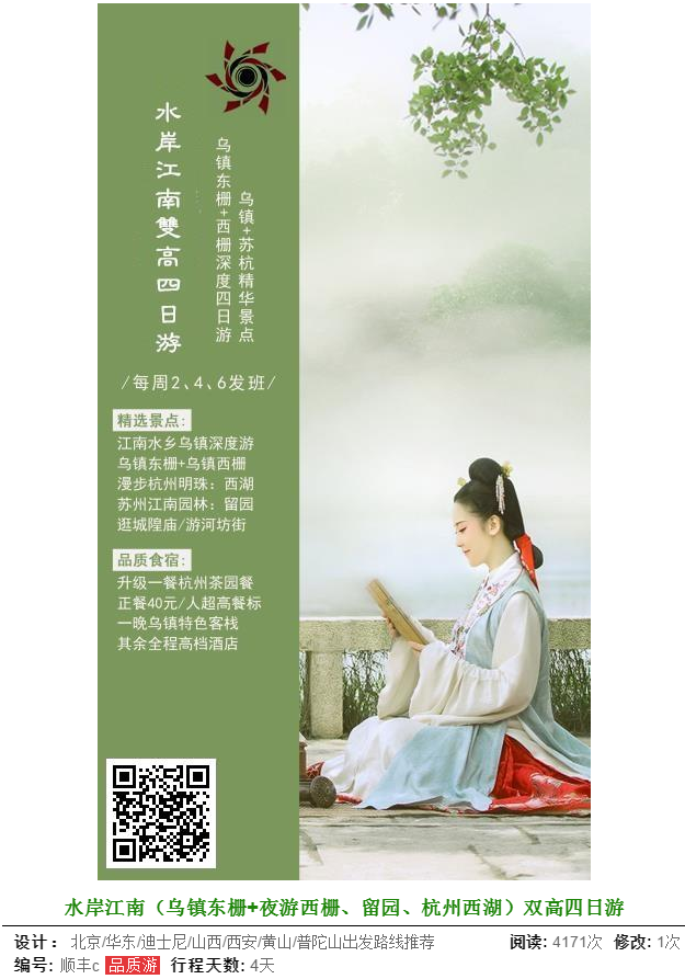 水岸江南(烏鎮(zhèn)東柵+夜游西柵、留園、杭州西湖)雙高四日游