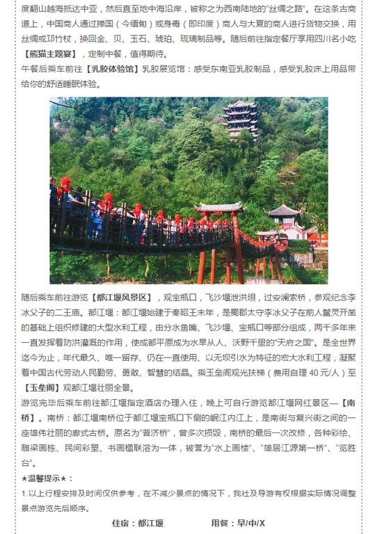 【錦上添花】熊貓基地、黃龍溪、船游樂山、峨眉山、報(bào)國(guó)寺、都江堰、玫瑰花溪谷、寬窄巷子、錦里、夜游九眼橋雙飛6日游 2019-5-4 本文被閱讀 2051 次