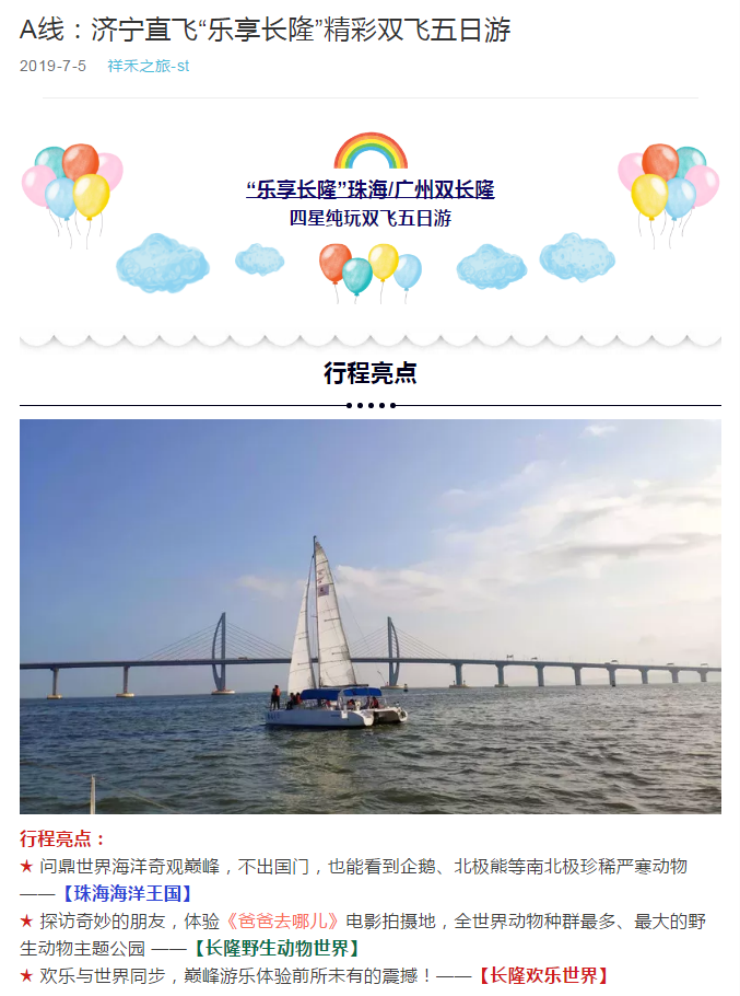 A線:濟(jì)寧直飛“樂享長隆”精彩雙飛五日游 2019-7-18 本文被閱讀 2031 次