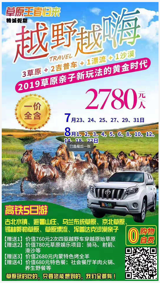 開著越野車玩草原特色親子高鐵5日游 2019-7-22 本文被閱讀 1893 次