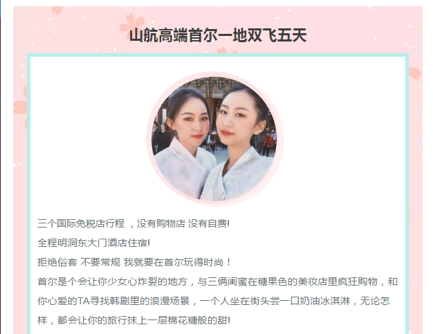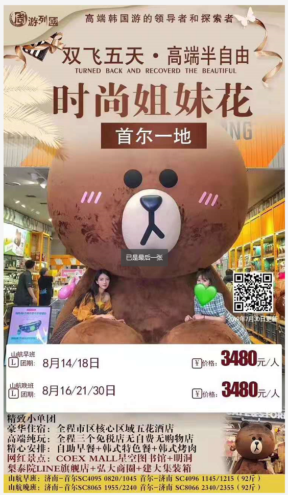 時(shí)尚姊妹花-首爾一地高端半自由-山航早班 2019-7-31 本文被閱讀 1775 次