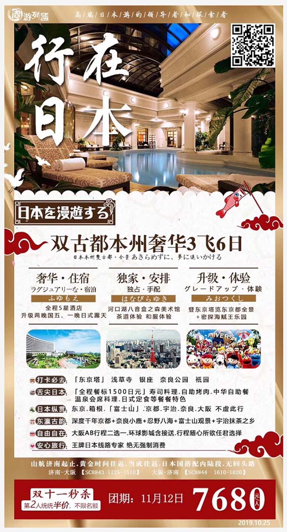 11-12月“行在日本”奢華3飛6日游 2019-11-3 本文被閱讀 1871 次