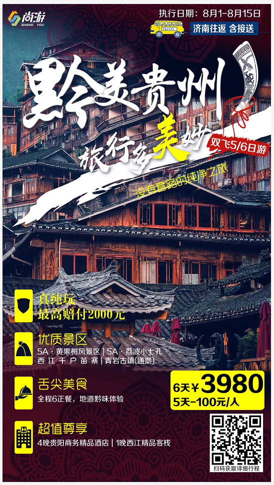 【黔美貴州】西江千戶苗寨、黃果樹瀑布、陡坡塘、天星橋、小七孔景區(qū)、青巖古鎮(zhèn)雙飛6天純玩尊貴游 2020-8-11 本文被閱讀 1819 次