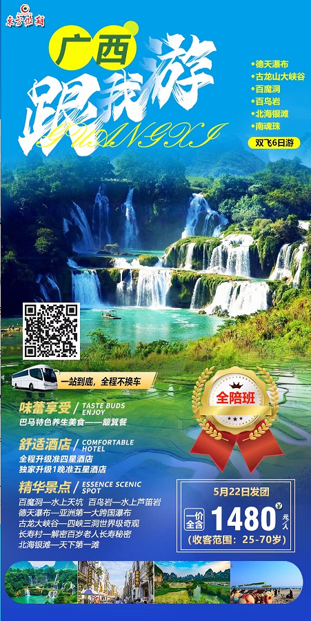 廣西南寧全陪班—南寧、德天、巴馬、北海雙飛六日游