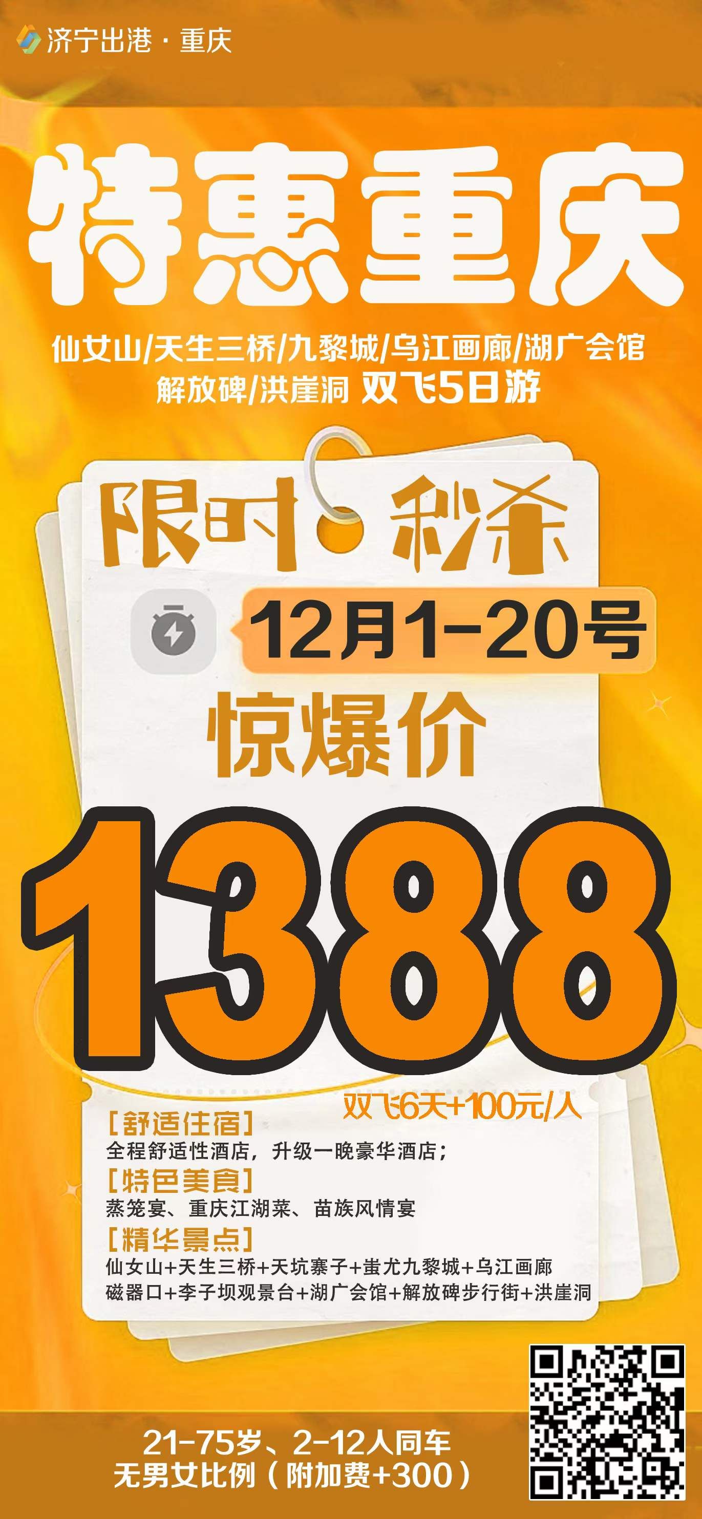 特惠重慶雙飛五/六日游 2023-12-6 本文被閱讀 832 次