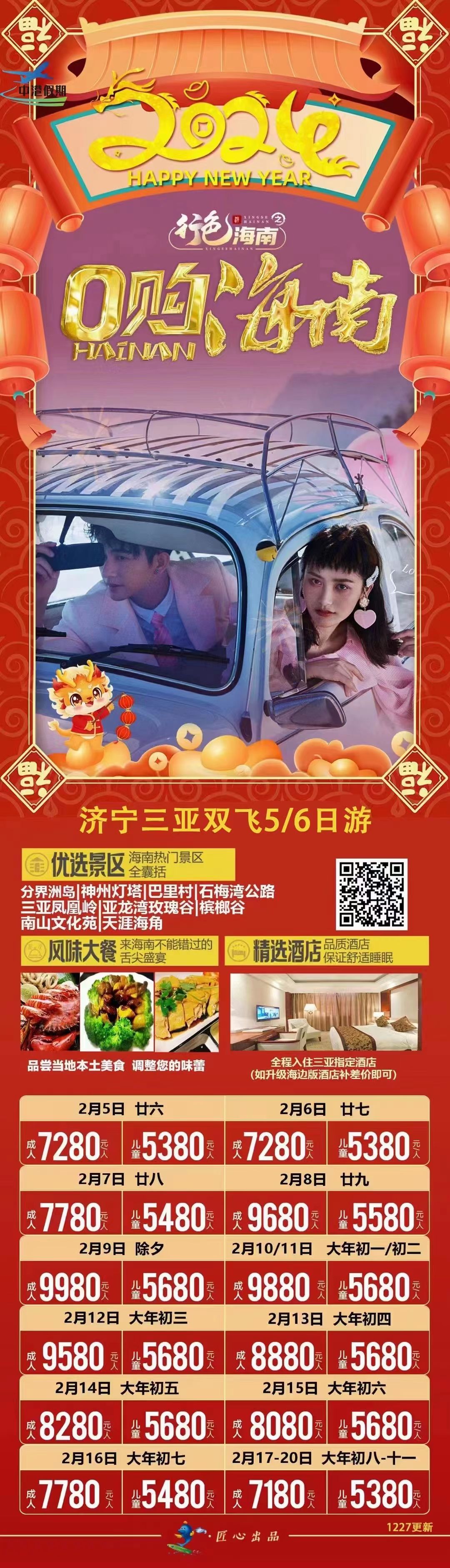 春節(jié)濟(jì)寧三亞雙飛5/6日游O購(gòu)海南 2024-1-3 本文被閱讀 778 次