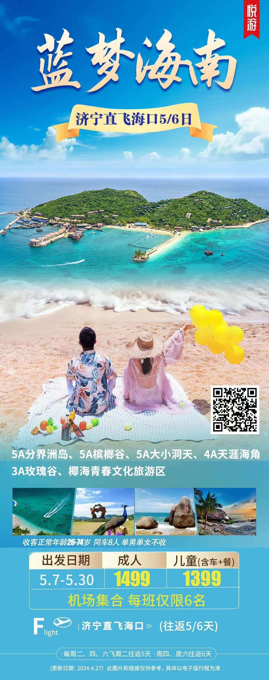 1499元 濟(jì)寧飛? 三亞雙飛六日游 2024-5-5 本文被閱讀 512 次