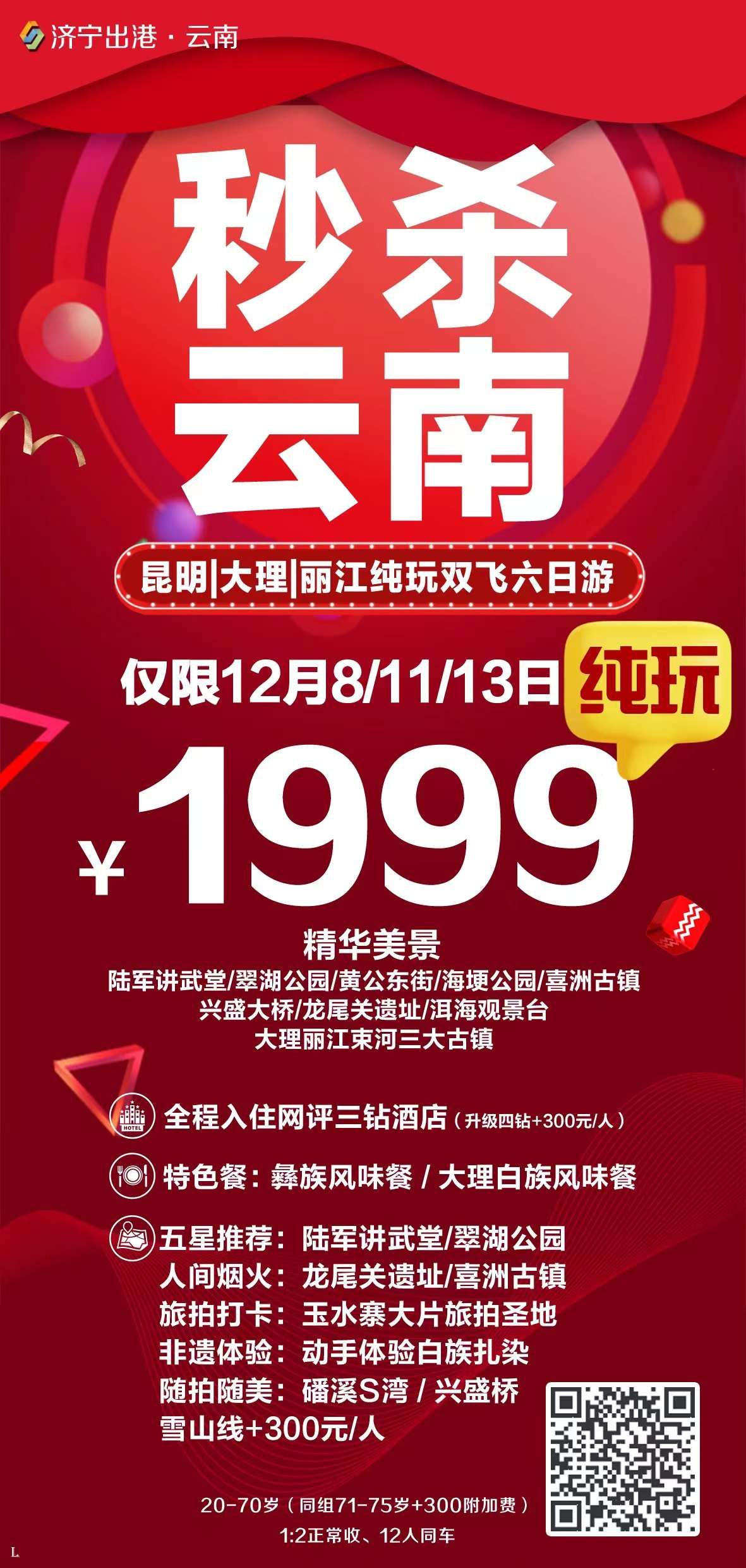 濟(jì)寧出港•特惠純玩云南雙飛六日游 2024-12-7 本文被閱讀 582 次